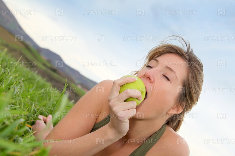 Красивая женщина, есть зеленое яблоко в природе
