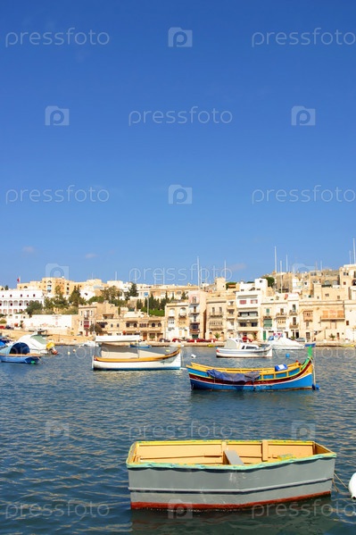 Ярко окрашенные Мальтийские лодки на голубой воде летом, Мальта