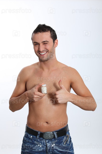 Улыбающийся человек, держащий бутылку таблетки