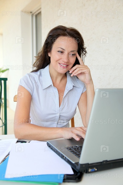 Женщина, работа на дому на портативном компьютере