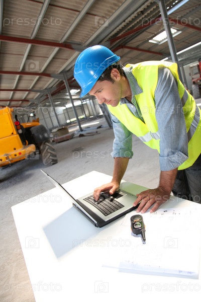 Инженер, используя портативный компьютер на строительной площадке