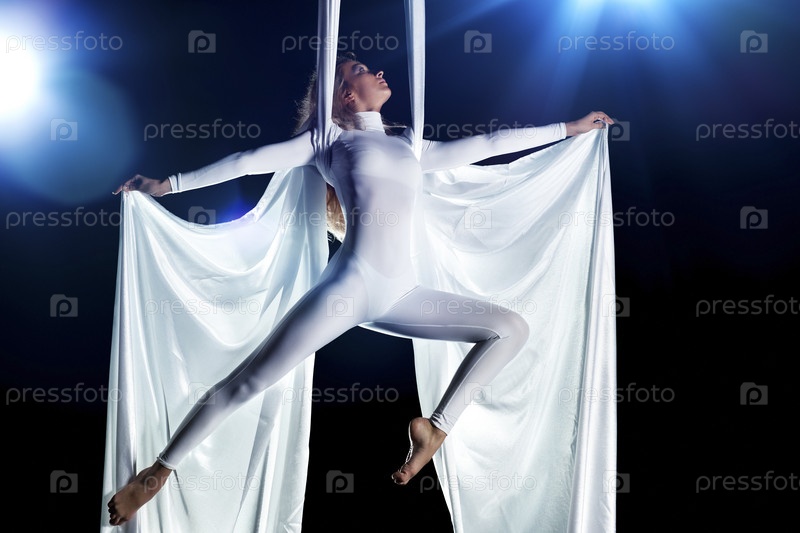 Молодая женщина гимнастка. На черном фоне с флеш-эффект
