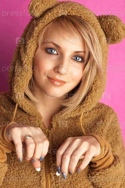 Молодая женщина в костюме медведя. На розовом фоне