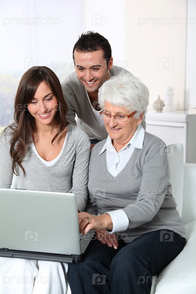 Пожилая женщина с внуками, глядя на портативный компьютер