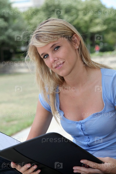 Красивая блондинка женщина, сидя в парке