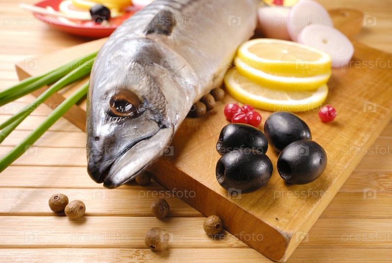 Свежей скумбрии с оливками, лимоны и лук через деревянные разделочные доски