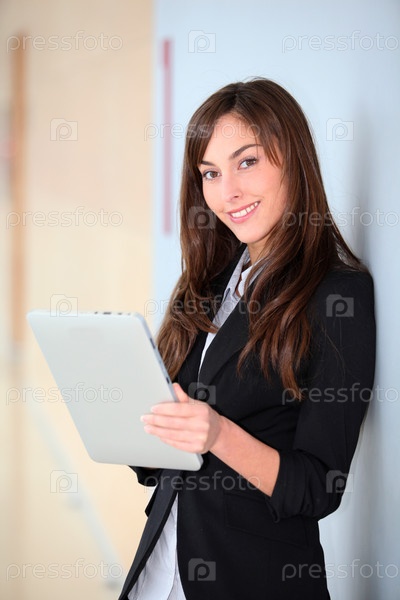 Предприниматель, стоя в зале с электронным планшетом