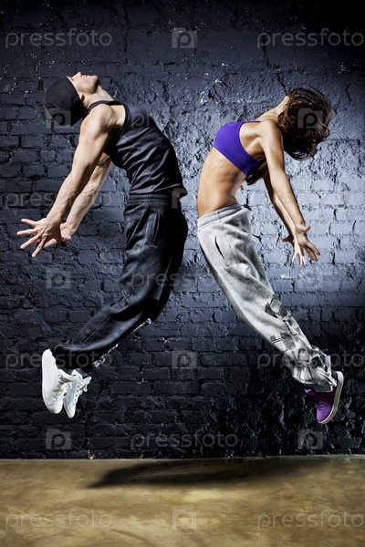 Молодой танцовщик пара прыжков. На фоне стены