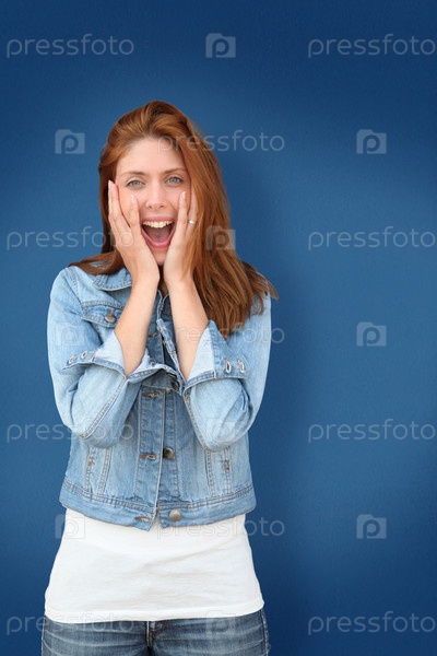 Женщина на синем фоне с пораженным взглядом