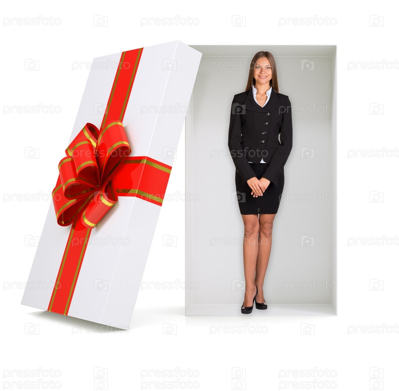 Предприниматель, глядя на камеру в подарочной коробке