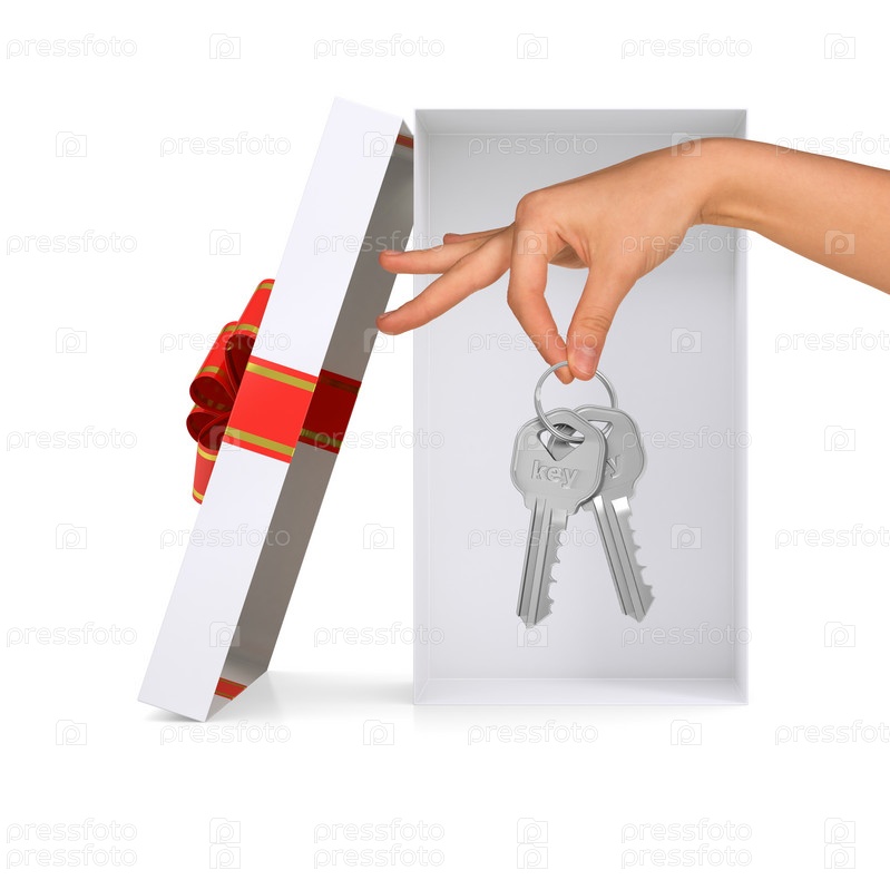 Подарочная коробка с рук и ключи на белом