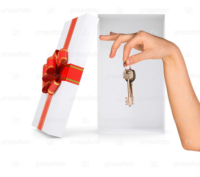 Открытый Подарочный ящик с рукой и ключами на белом