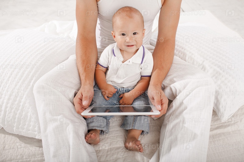 Молодой отец с сыном девять месяцев с цифрового планшета