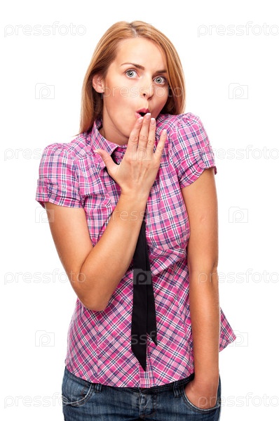 Удивленная девушка на белом фоне