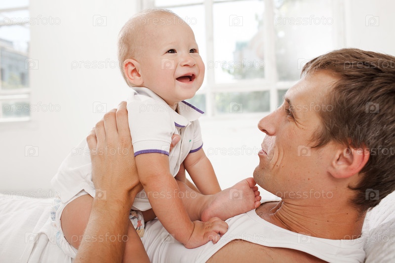 Молодой отец с сыном девять месяцев на кровати у себя дома