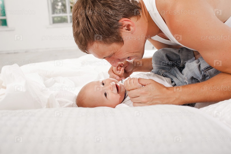 Молодой отец с сыном девять месяцев на кровати у себя дома