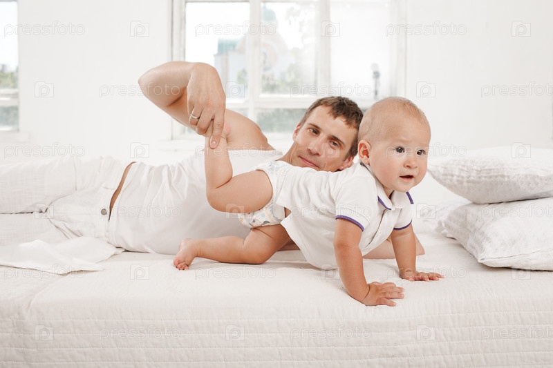 Молодой отец с сыном девять месяцев на кровати у себя дома