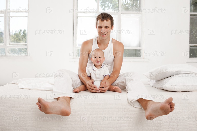 Молодой отец с сыном девять месяцев на кровати у себя дома