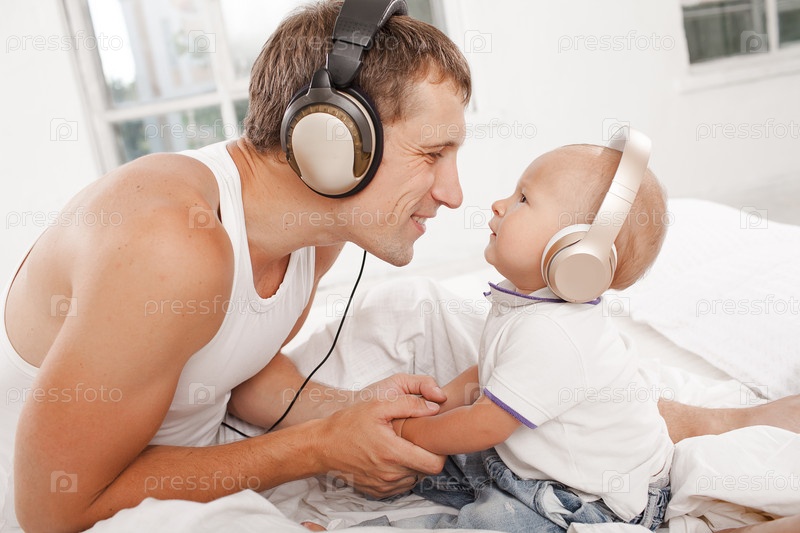 Молодой отец с его девяти месяцев СОМ на кровати у себя дома