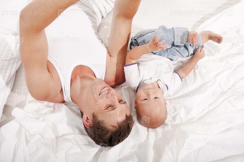 Молодой отец с сыном девять месяцев на кровати у себя дома