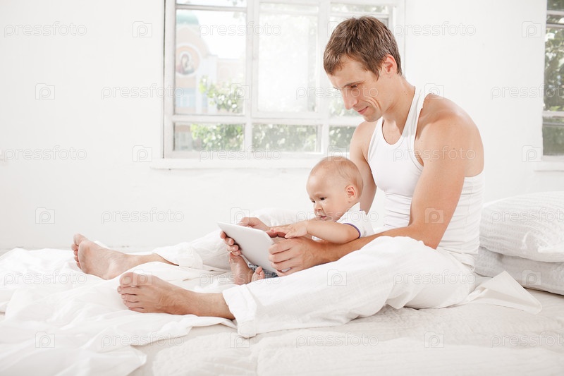 Молодой отец и сын девять месяцев с цифрового планшета