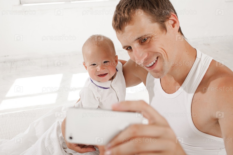 Молодой отец с сыном девять месяцев на кровати у себя дома