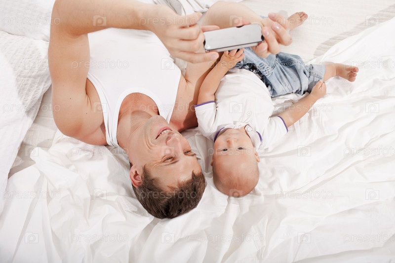Молодой отец с сыном девять месяцев на кровати у себя дома
