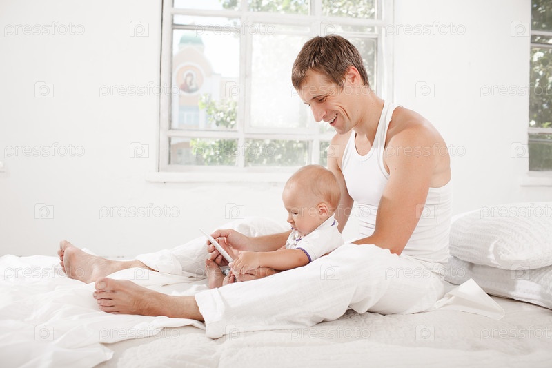 Молодой отец и сын девять месяцев с цифрового планшета