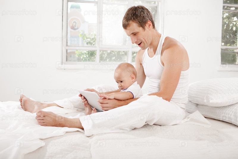 Молодой отец и сын девять месяцев с цифрового планшета