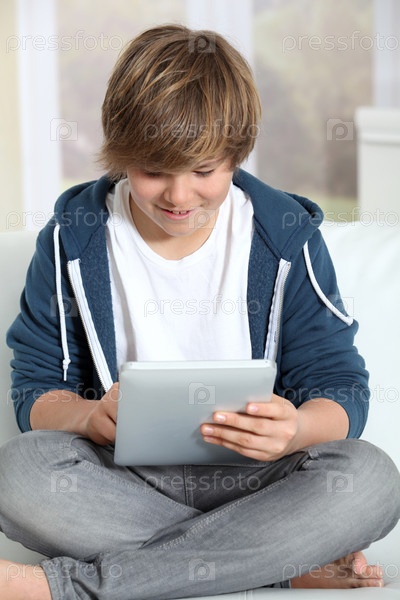 Молодой подросток мальчик на дому с использованием электронных таблетки