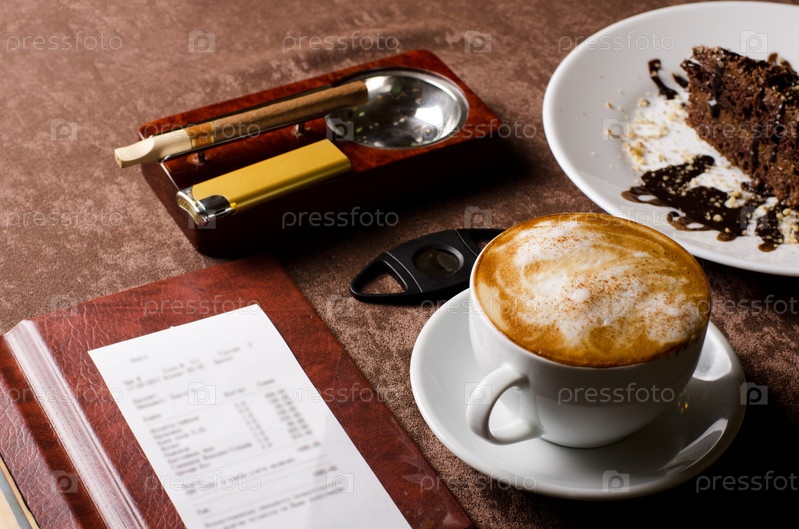 Кофе, шоколадный десерт, пепельница с сигаретой и счет на столе в кафе