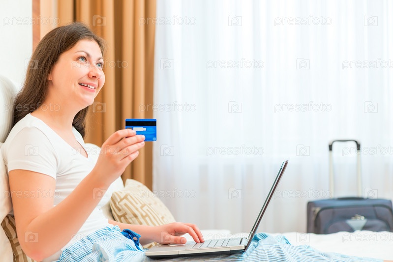 Женщина с кредитной карты и ноутбук, мечтая о празднике