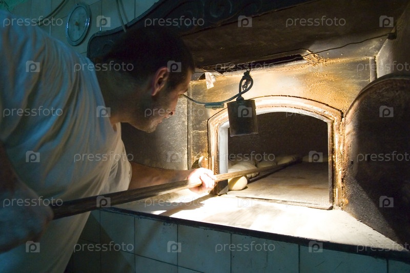 Пекарь удаляет свежеиспеченный хлеб из его древесины огнем печь, Мальта