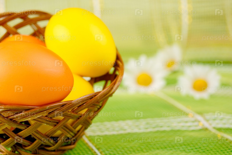Пасхальные яйца в плетеной корзине на зеленом фоне