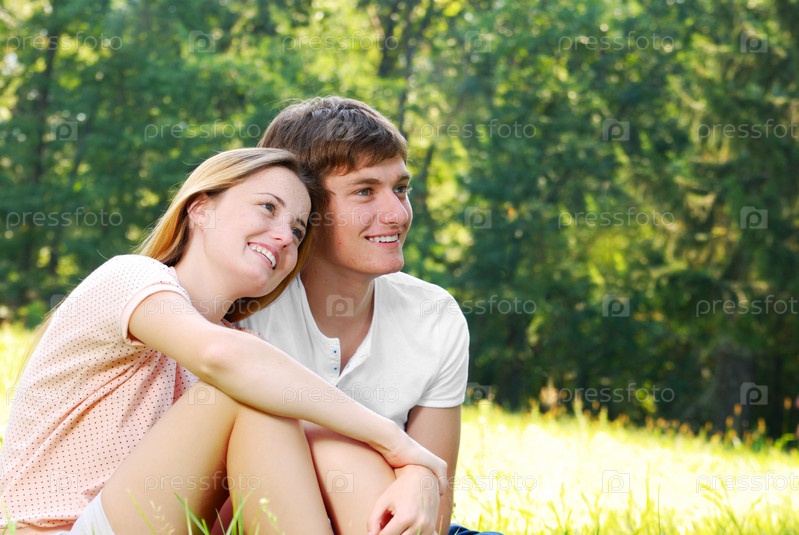 Счастливая молодая пара, сидя на траве