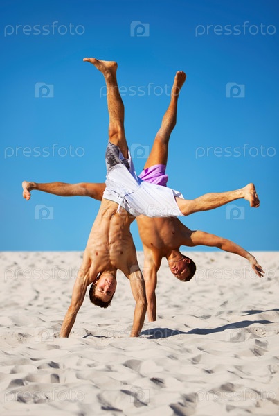 Двух спортсменов на пляже. На фоне голубого неба