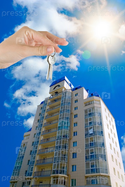 Ключ в руке и многоэтажный жилой дом на фоне голубого солнечного неба