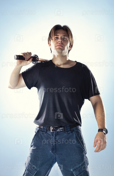 Сильный человек с самурайский меч. На мягких синем фоне