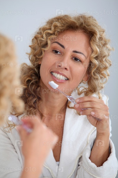 Портрет женщины, ее зубы перед зеркалом