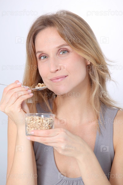 Крупным планом красивая блондинка женщина ест каши