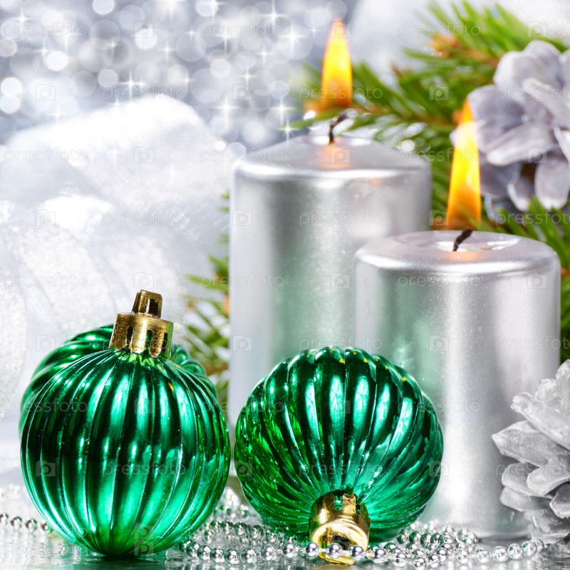 Рождественские шары с серебряные свечи на ярком фоне