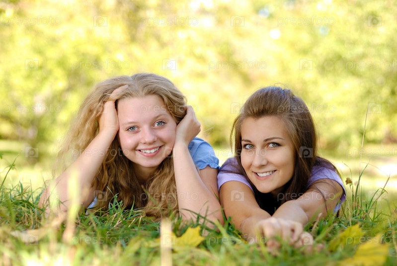 Две девочки-подростки счастливым весело на открытом воздухе