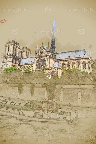 Нотр Дам и лодка, вид с Сены