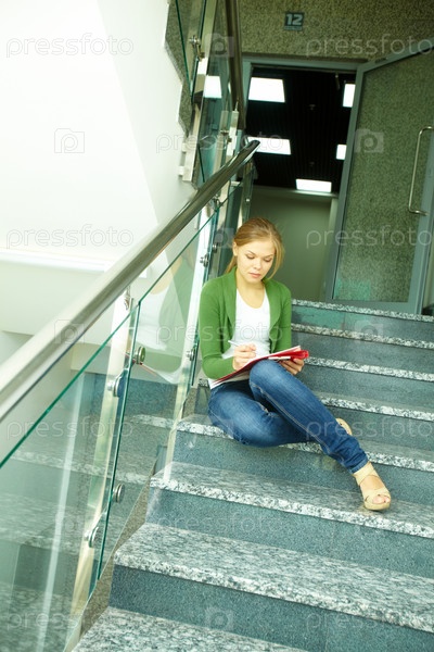 Студентка занимается на ступеньках в колледже