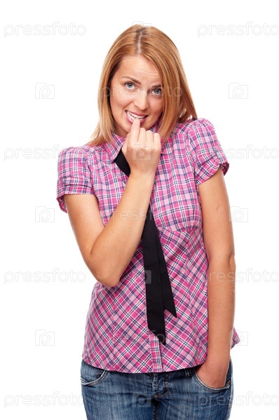 Застенчивая красивая девушка на белом фоне
