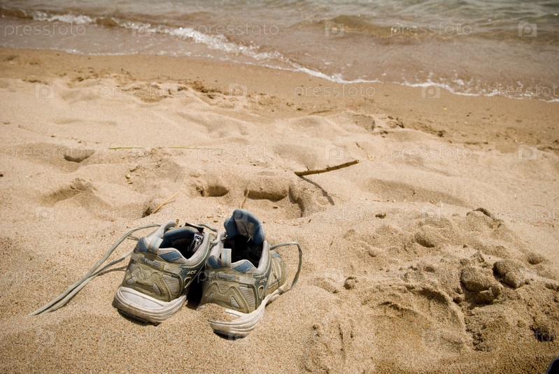 Кроссовки на морском песчаном берегу