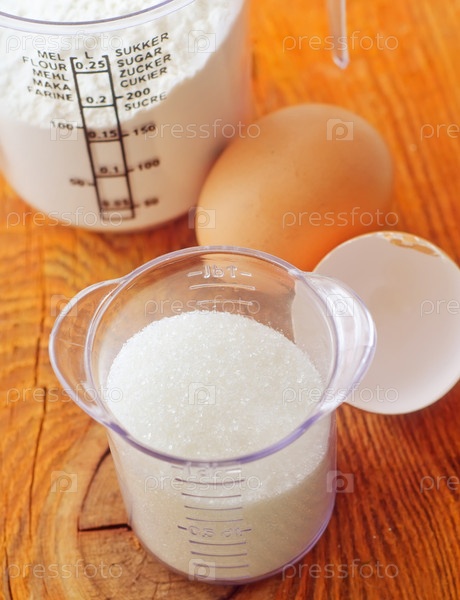 Сахар, мука и сырые яйца на деревянной доске