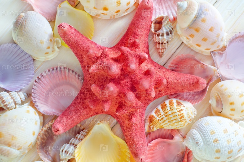 Ракушки на деревянном фоне
