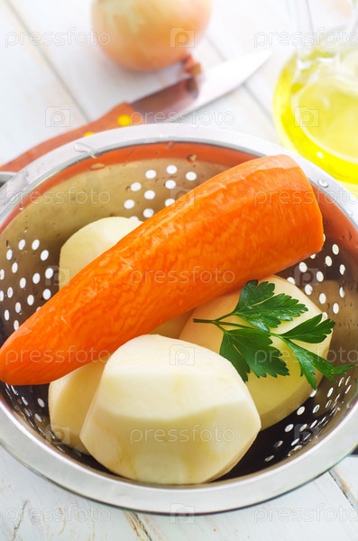 Сырой картофель и морковь в металлическую чашу