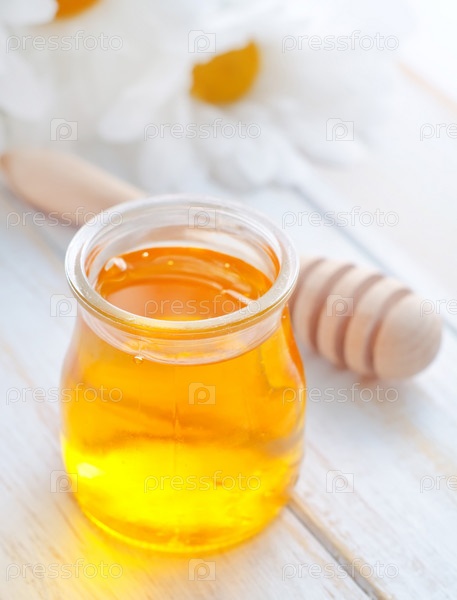 Свежего меда в стеклянной банке и ромашки